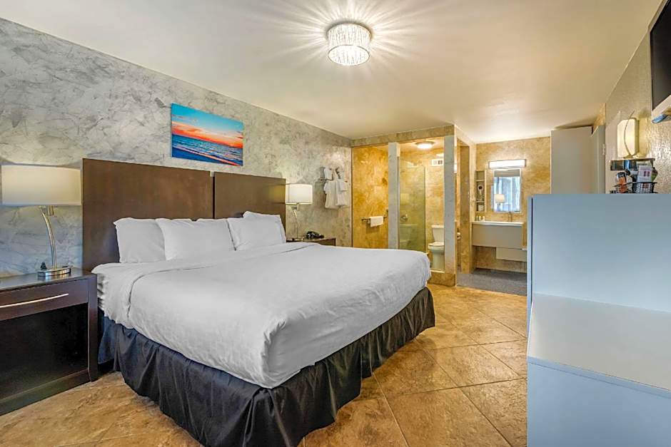 This room features a flat-screen TV, microwave, and small refrigerator.